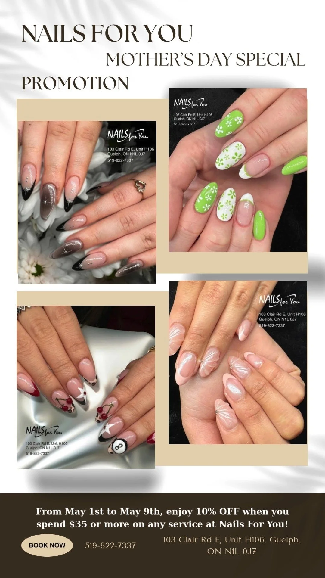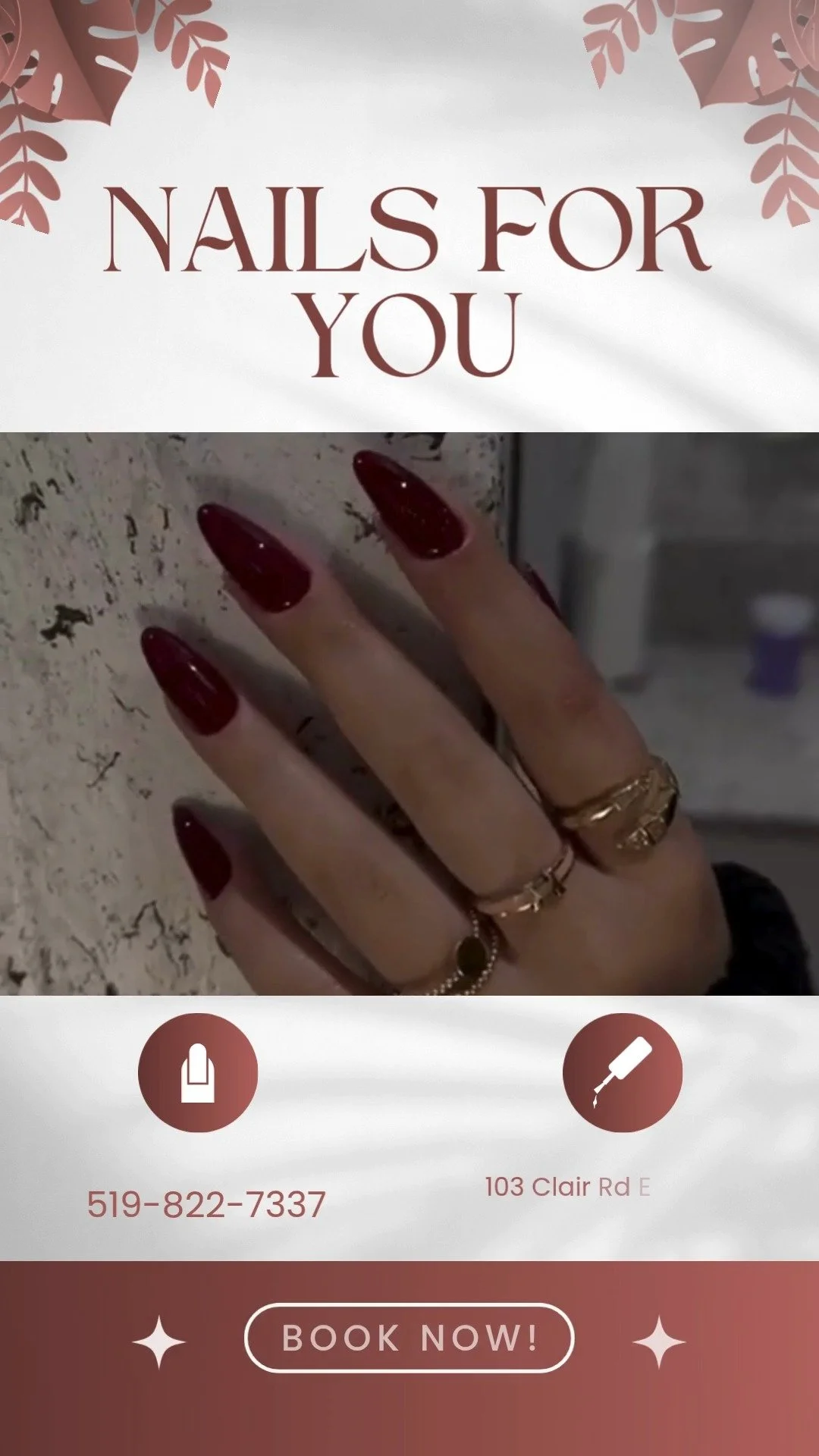 Your premier destination for nail care and artistry, located at 103 Clair Rd East, Guelph, ON. We pride ourselves on creating a relaxing and inviting atmosphere where you can indulge in a variety of nail services.